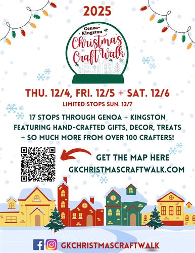 2025 Genoa-Kingston Craft Walk on Thursday 12/4, Friday 12/5, Saturday 12/6, and limited stops on Sunday 12/7!