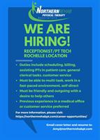 Northern Rehab Physical Therapy Specialists are seeking a motivated and organized Physical Therapy Technician/Receptionist to join our busy, patient-centered clinic in Rochelle. In this versatile role, you'll support both front-office operations and direct patient care in a fast-paced, collaborative environment.